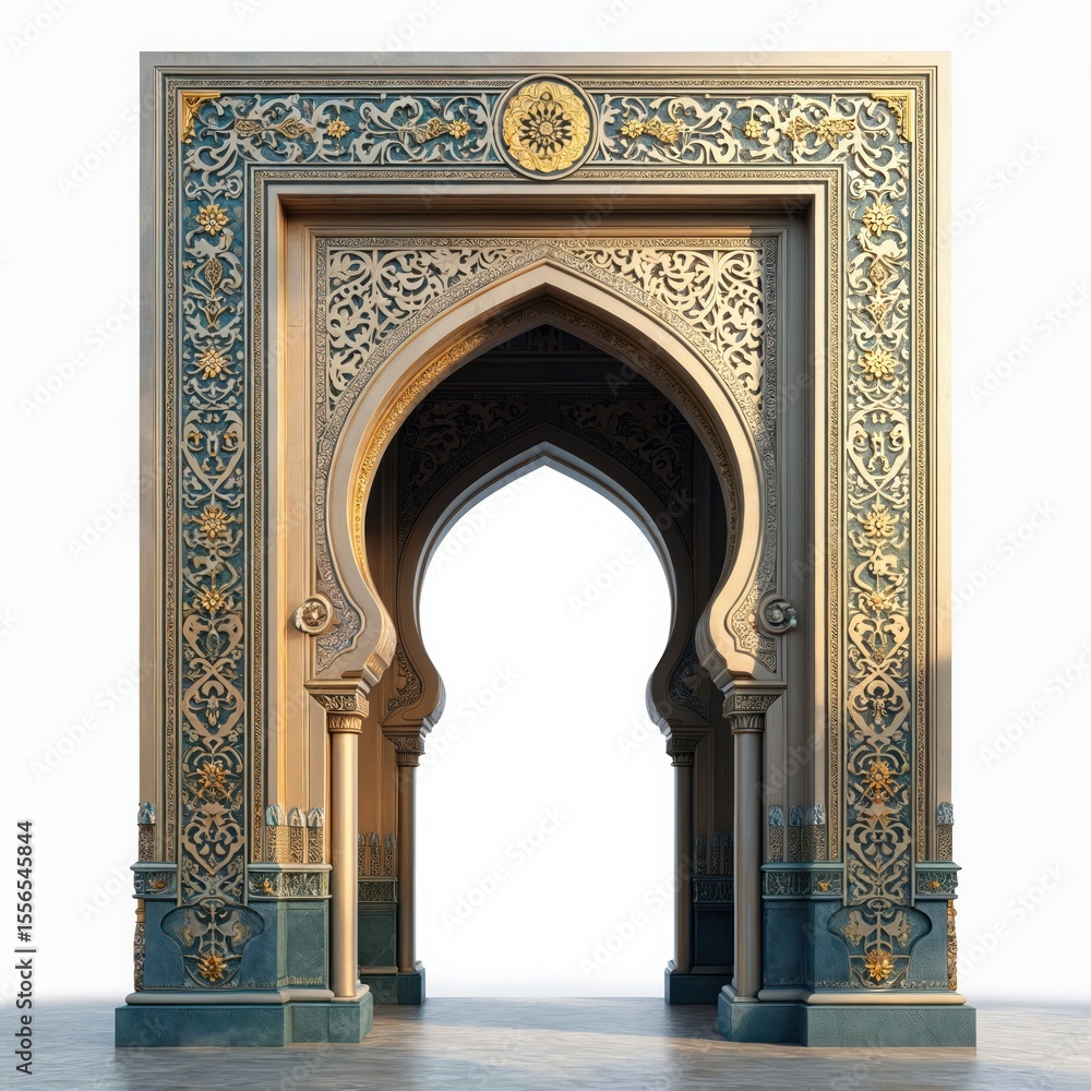 Intricate islamic archway with detailed carvings and geometric patterns isolated on transparent background, showcasing traditional architectural design