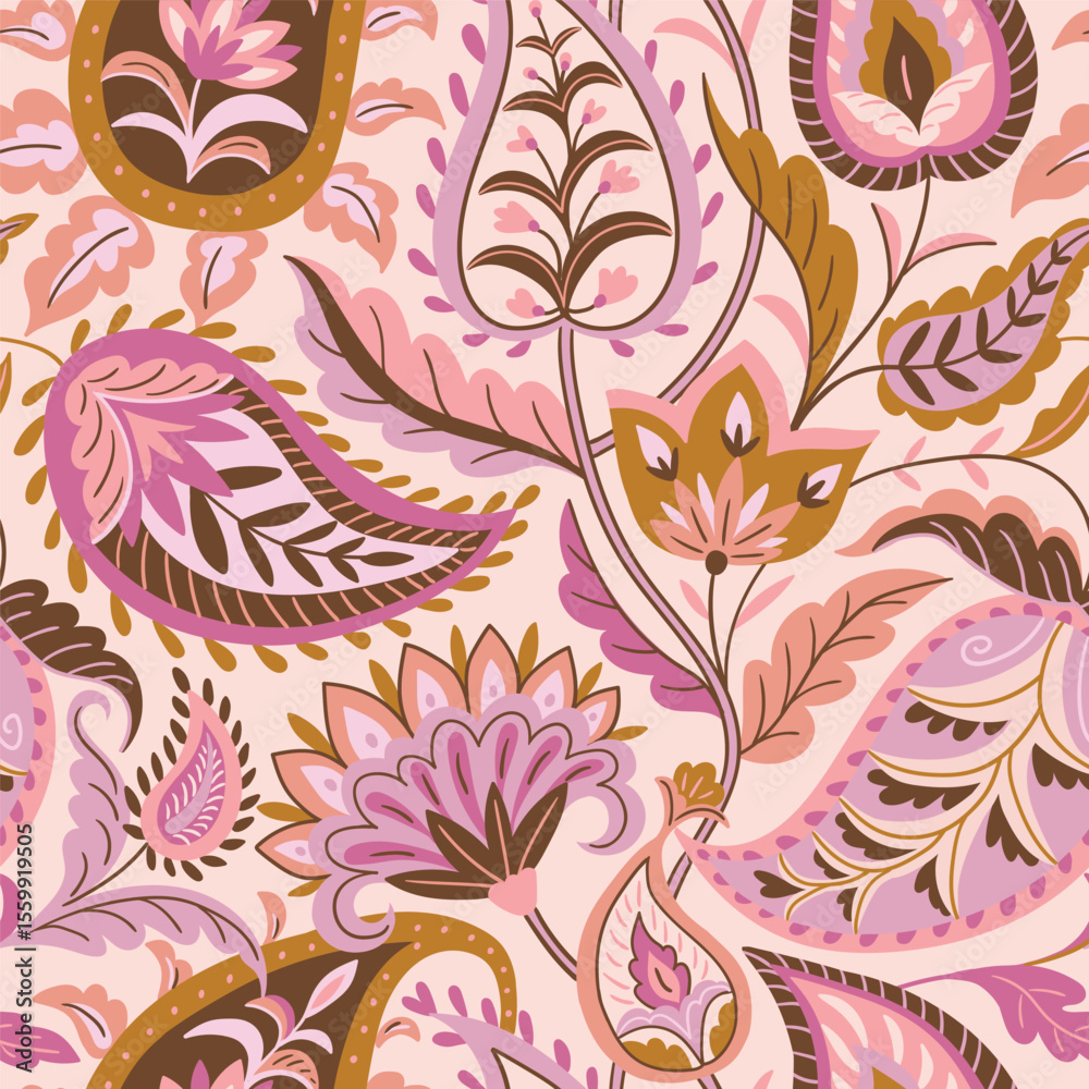 Vector Seamless Traditional Indian Paisley Pattern On Pink Wallpaper Mural - Decorly Solutions | Decorly Solutions
