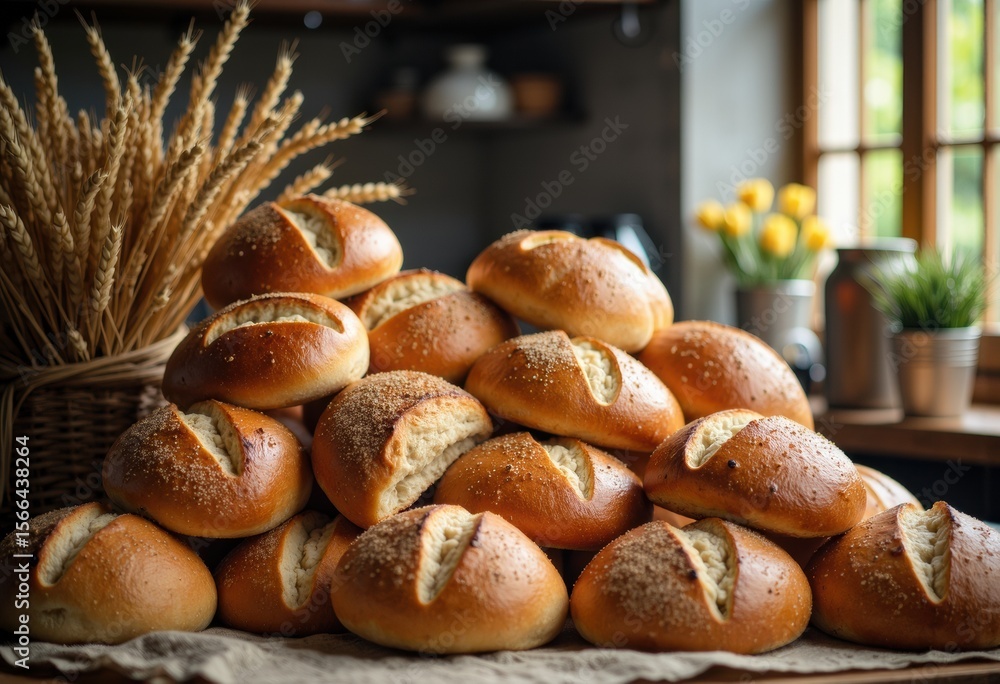 Freshly baked bread rolls stacked on a rustic table in a coz Wallpaper