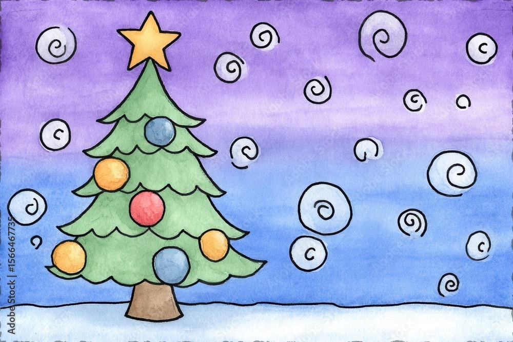 Vibrant watercolor christmas tree with ornaments and glowing star against night sky