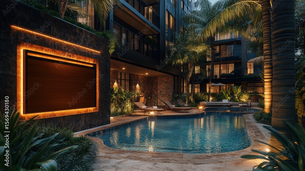 Luxury Condo Swimming Pool with palm trees: An opulent swimming pool nestled between luxurious condos, palm trees under a clear sky offering a serene escape.