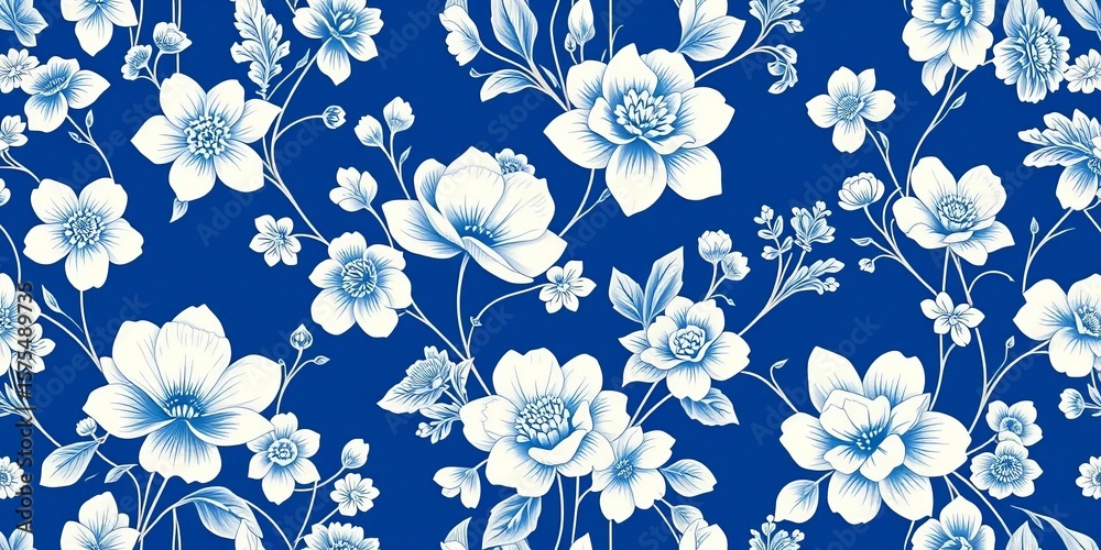Blue and white chinoiserie floral bloom seamless pattern Spr Wallpaper