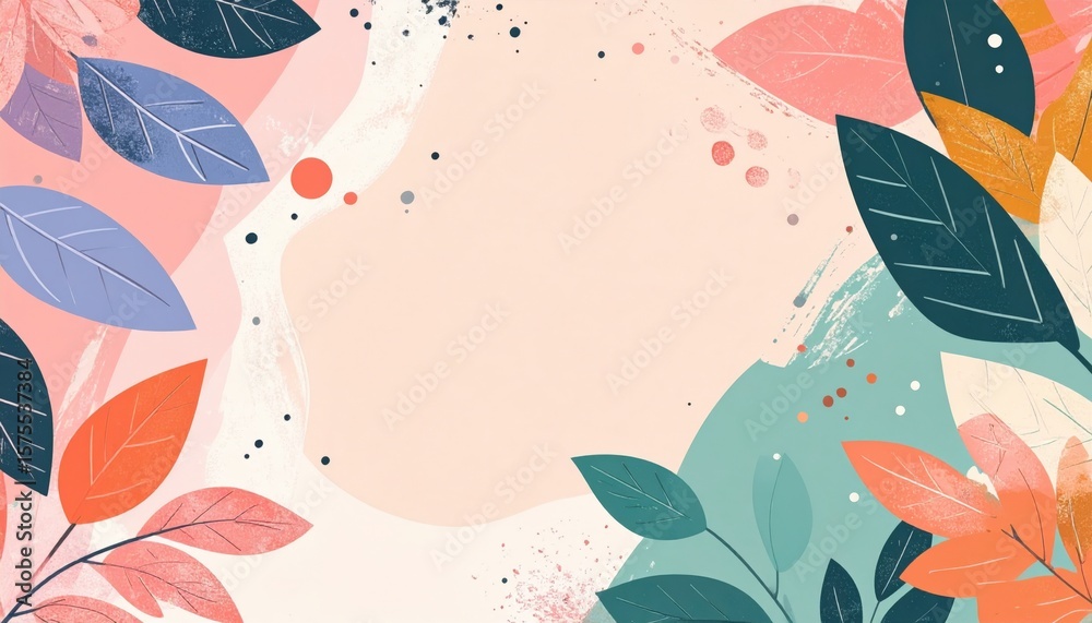 A decorative graphic design featuring abstract shapes and leaves, nature, background, banner in soft color.