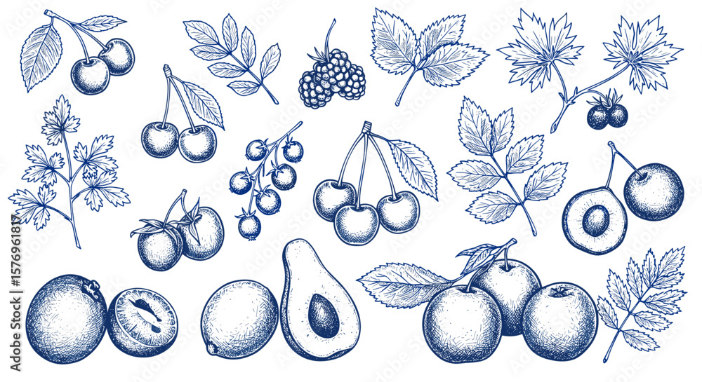 Hand Drawn Collection Of Fruits And Leaves In Wallpaper Mural - Decorly Solutions | Decorly Solutions