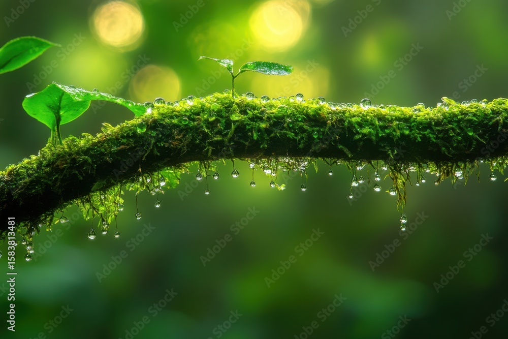 Dewdrops Cling To A Mossy Branch In A Wallpaper Mural - Decorly Solutions | Decorly Solutions