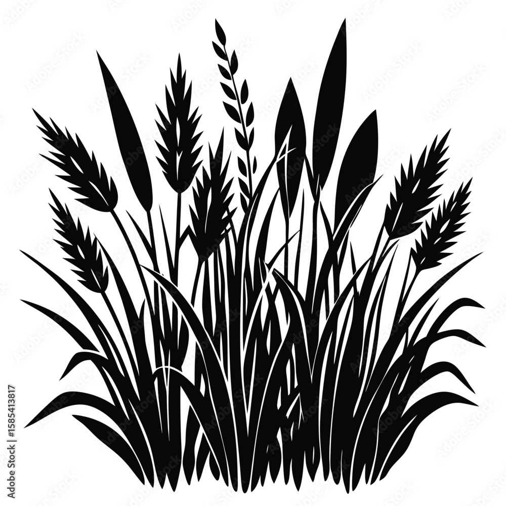 Black silhouette of tall grass blades with cattails on a white background, nature-themed illustration