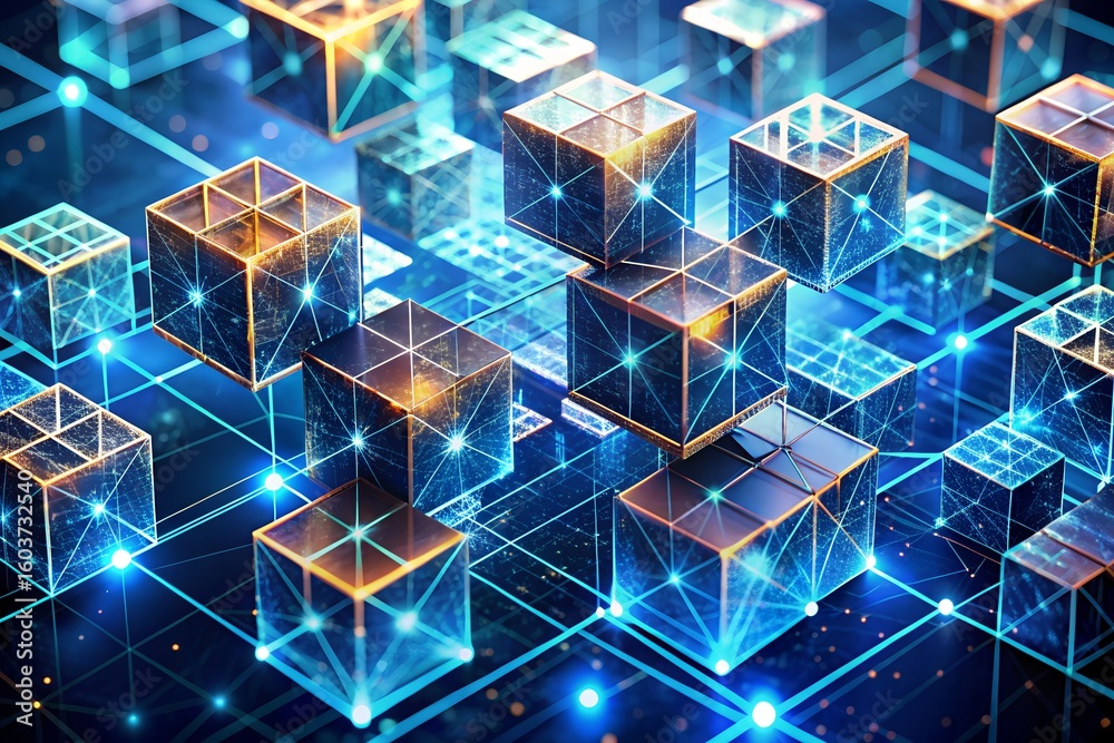 Photo of interconnected cubes glowing with blue light repres Wallpaper