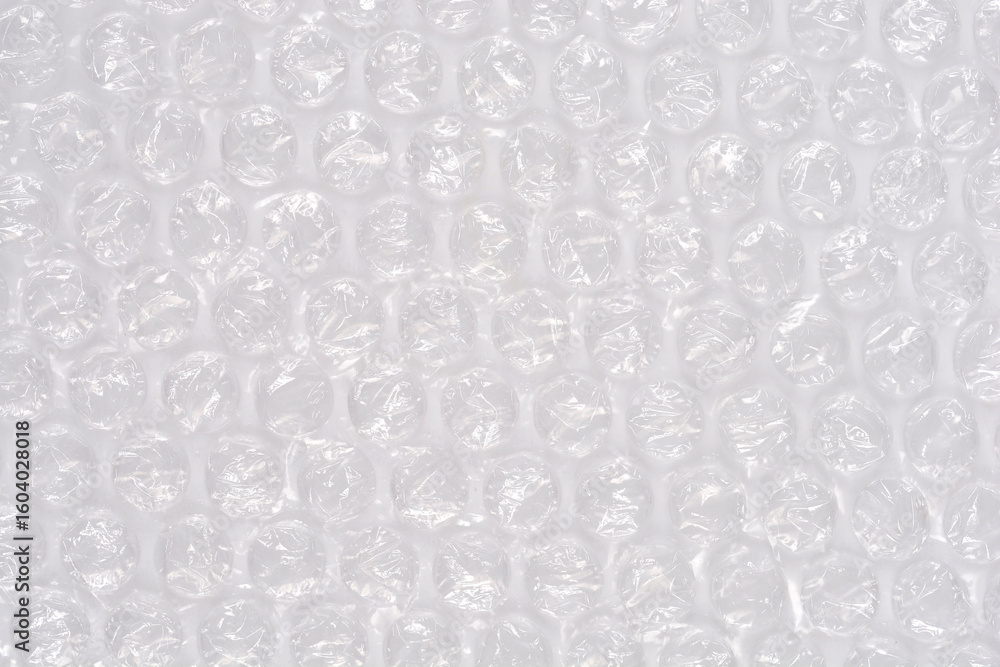 A horizontal, full-frame macro shot of clear plastic bubble wrap, creating a repetitive texture of inflated air pockets