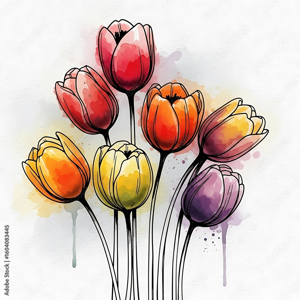 Watercolor Tulips Illustration With Black Outlines And Vibrant Wallpaper Mural - Decorly Solutions | Decorly Solutions