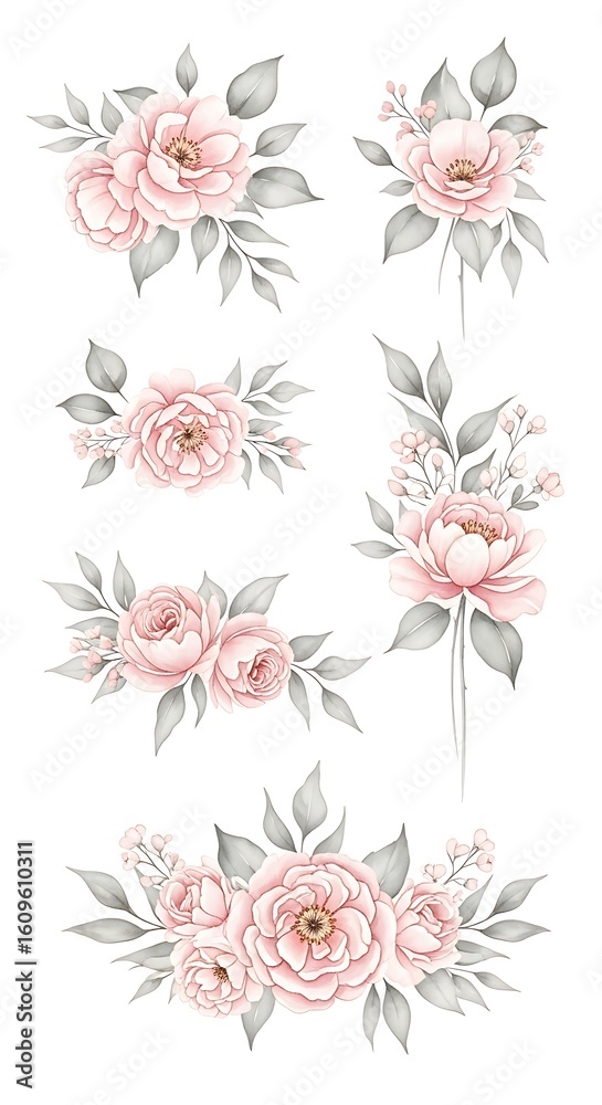 A collection of detailed illustrations of delicate pink peonies and buds, presented with elegant green leaves, set against a bright white background.