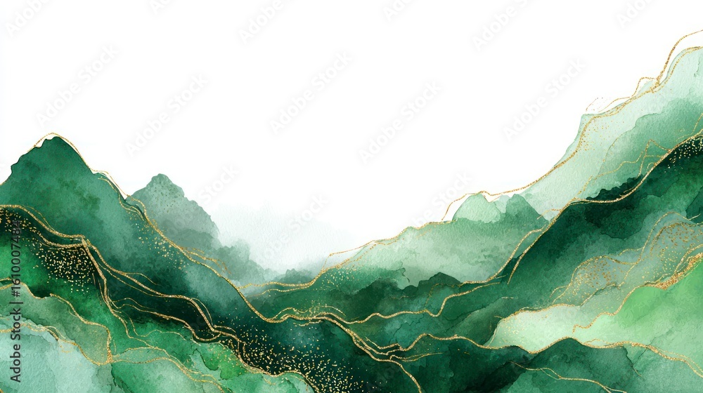 Abstract Watercolor Landscape Of Rolling Green Hills And Mountains, Accented With Gold Leaf Detailing, Set Against A White Background