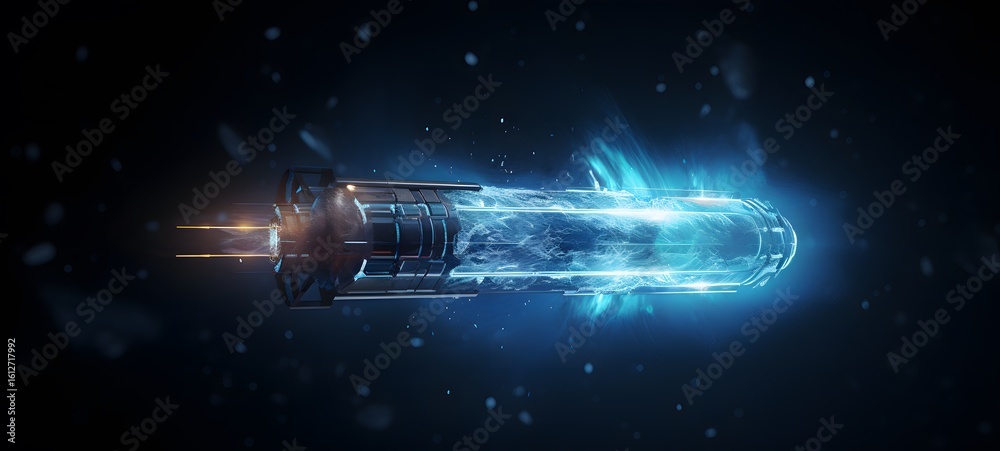 A futuristic transparent tube contains glowing electronic circuitry and light particles against a dark background with bokeh effects. It represents high-speed data transmission.