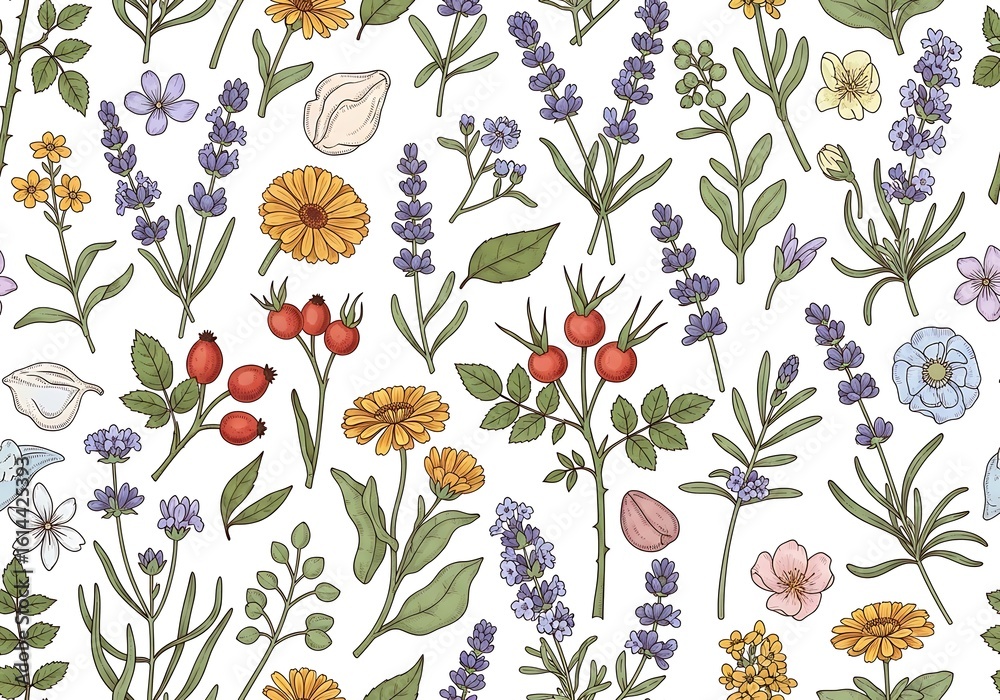 Hand-drawn Botanical Seamless Pattern With Lavender Calendula And Wallpaper Mural - Decorly Solutions | Decorly Solutions