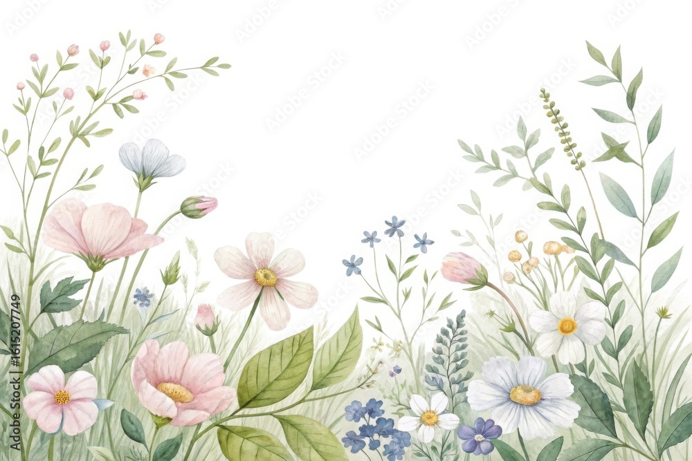 Delicate watercolor meadow flowers and greenery border Wallpaper