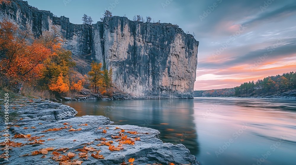 Autumn Sunset Over River And Majestic Cliff Face Wallpaper Mural - Decorly Solutions | Decorly Solutions