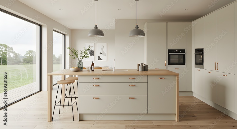 Modern Kitchen Interior With Island Appliances And Large Wallpaper Mural - Decorly Solutions | Decorly Solutions