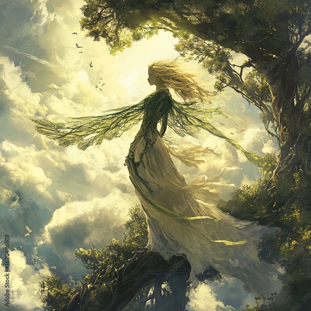 Ethereal woodland goddess draped in nature amidst a surreal Wallpaper