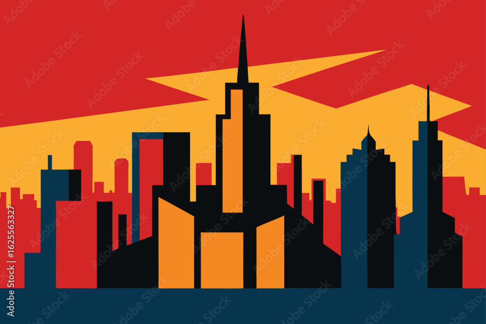 Urban skyline at sunset. Warm radial background, graphic design use