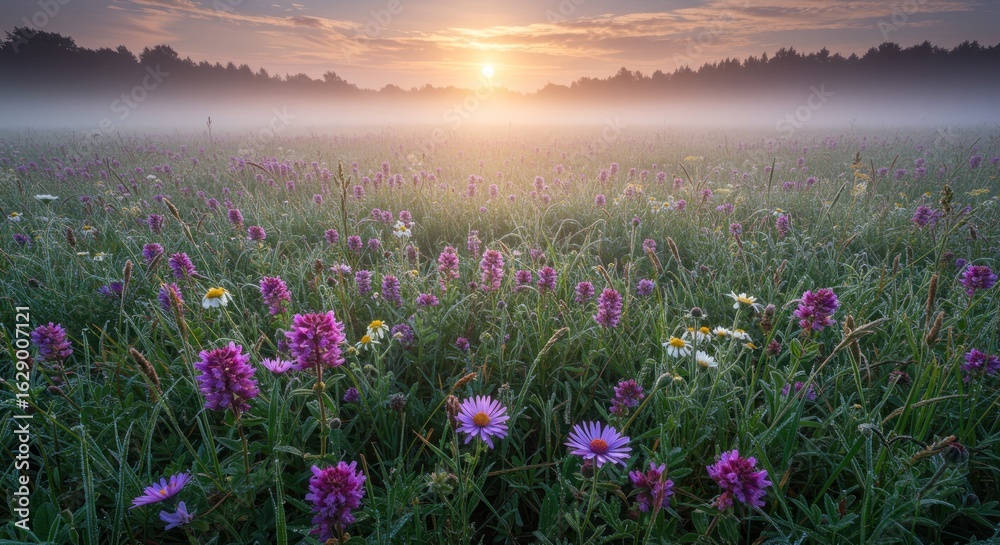 Misty Meadow Sunrise Purple Flowers And Dew-kissed Grass Wallpaper Mural - Decorly Solutions | Decorly Solutions