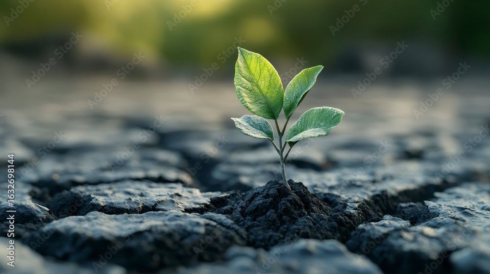 A vibrant green plant emerging from cracked soil, symbolizing growth, resilience, and the hope of new beginnings in nature.