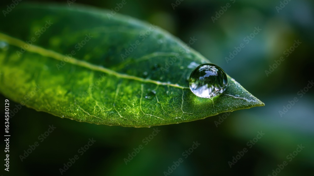 Pristine Water Droplet on Green Leaf during Rain, Symbolizing Nature's Freshness and Purity