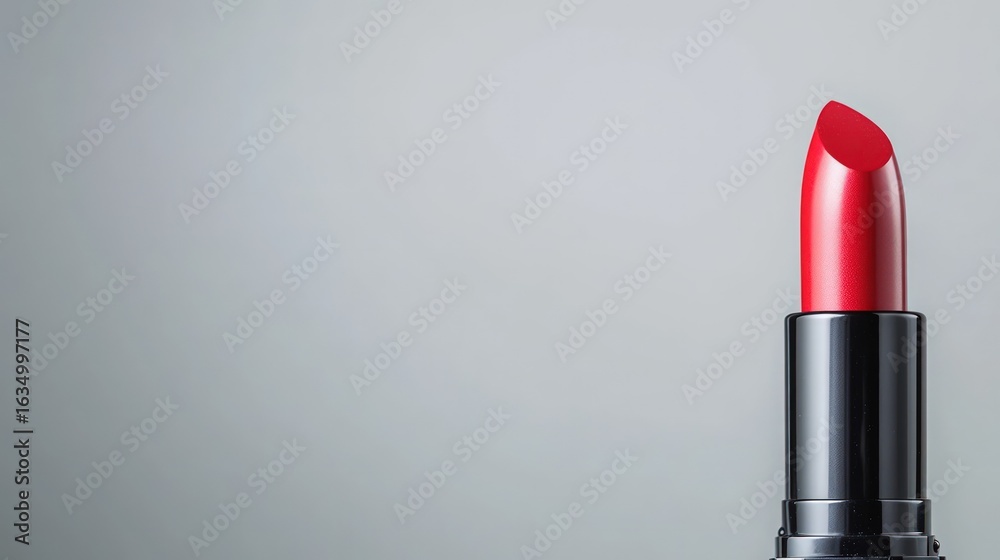 glossy lipstick tube in rich red shade stands elegantly against minimalistic background, showcasing its vibrant color and sleek design