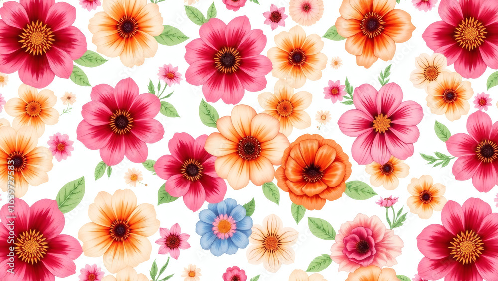 Vibrant watercolor floral seamless pattern with colorful spring flowers and green leaves on a white background. Artistic botanical illustration.