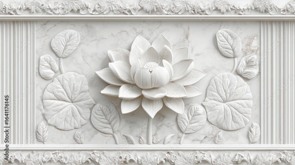 Intricate White Marble Relief Depicting A Lotus Flower Wallpaper Mural - Decorly Solutions | Decorly Solutions