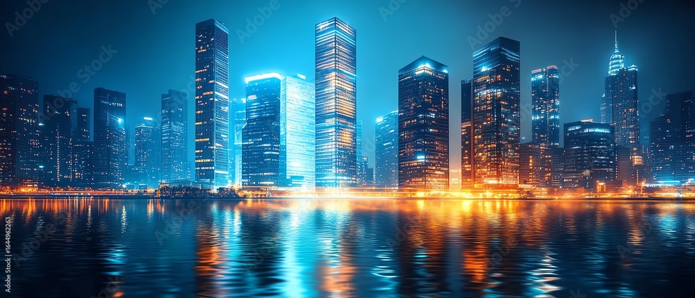 Vibrant City Skyline At Night With Reflections Wallpaper Mural - Decorly Solutions | Decorly Solutions