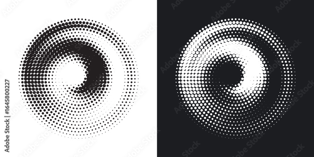 Geometric Circular Halftone Dots Swirl Design, Modern Logo Icon Frame in Black and White Contrast Vector