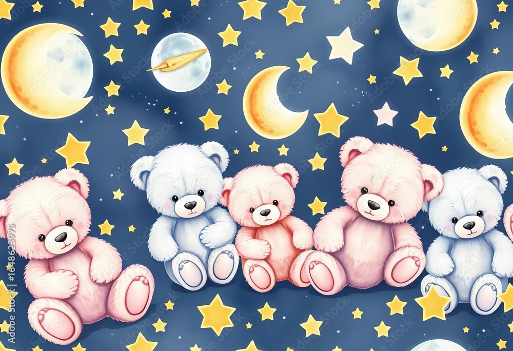 Soft Pastel Teddy Bears Nestled Amongst Watercolor Moons Wallpaper Mural - Decorly Solutions | Decorly Solutions
