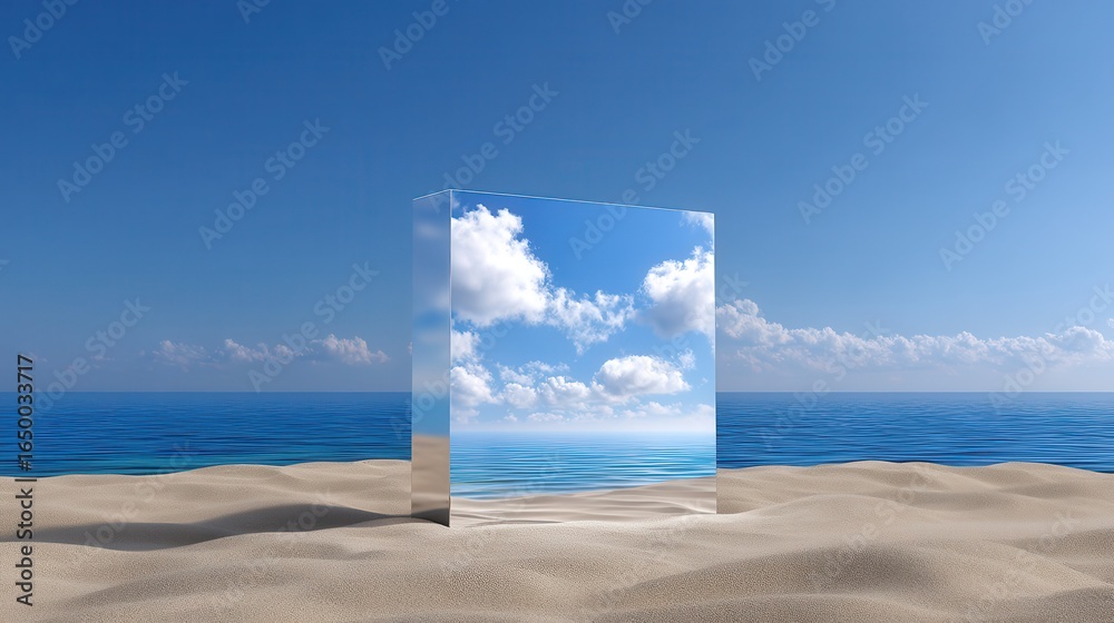 Rectangle mirror on beach reflecting sky & ocean