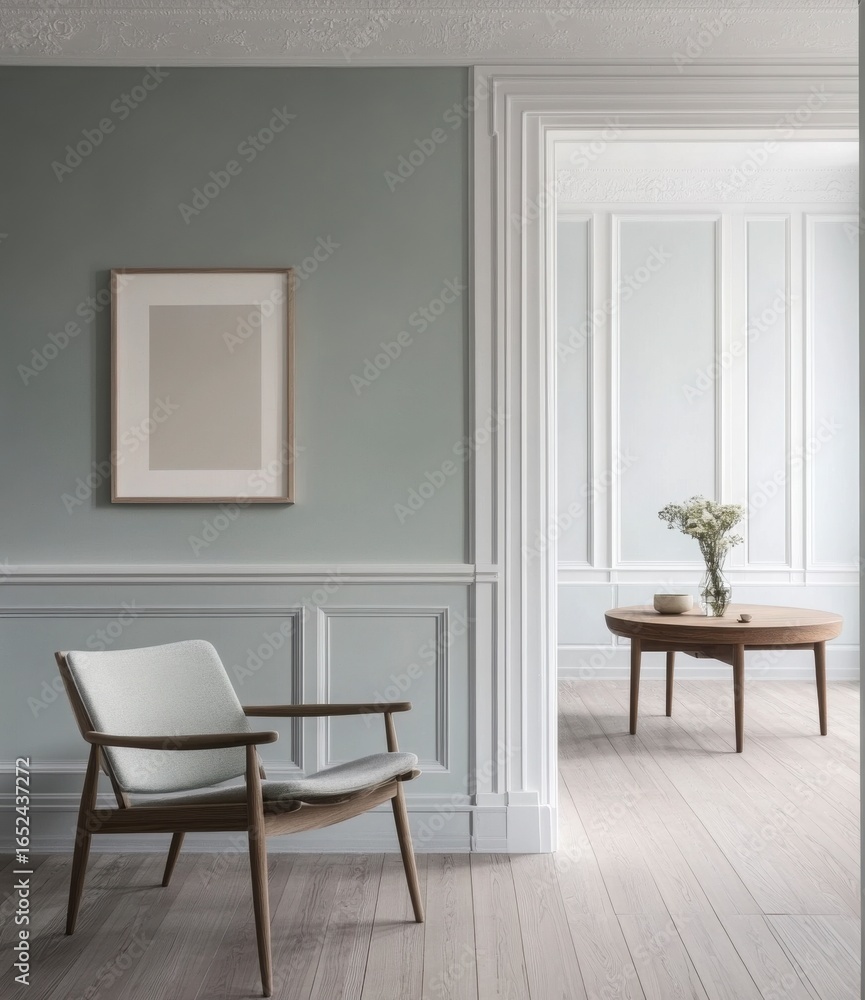Elegant Wooden Frame Beside a Chic and Modern Chair in a Minimalist Interior Design