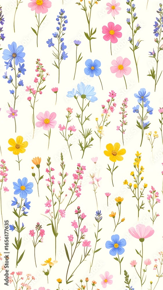 A seamless pattern of pink, blue, and yellow flowers creates a cheerful floral design on a white background