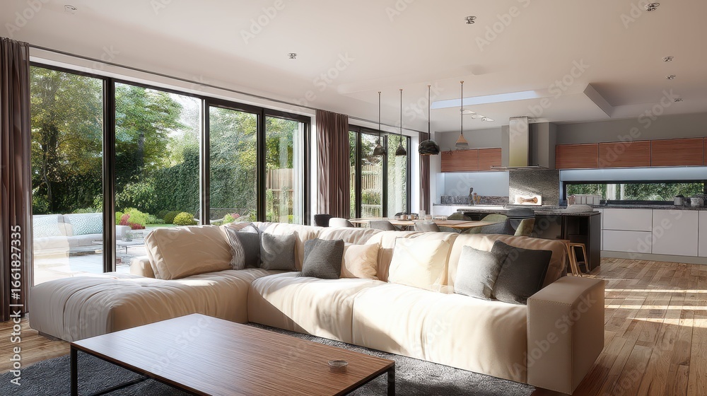 Modern Open Living Room And Kitchen Design With Wallpaper Mural - Decorly Solutions | Decorly Solutions