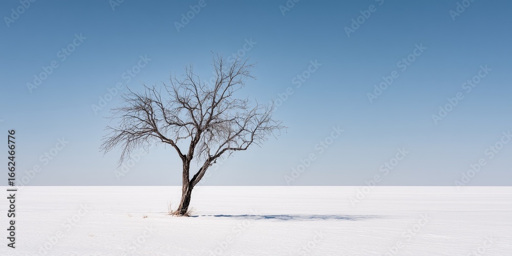Minimalist winter landscape featuring a single bare tree with thin black branches in a vast white snowfield, 80% pale blue sky, off-center composition, high contrast, clean scene