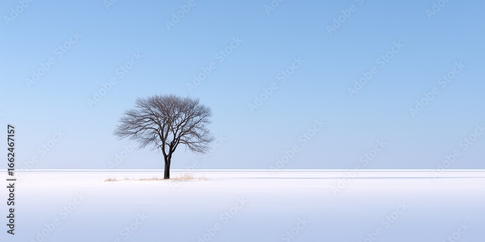 Minimalist winter landscape featuring a single bare tree with thin black branches in a vast white snowfield, 80% pale blue sky, off-center composition, high contrast, clean scene