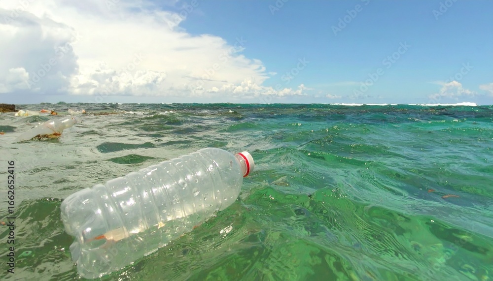Plastic water bottle floating in the sea. Problem plastic bottles and microplastics floating in the open ocean. Marine plastic pollution concept. Plastic water bottle floating on water