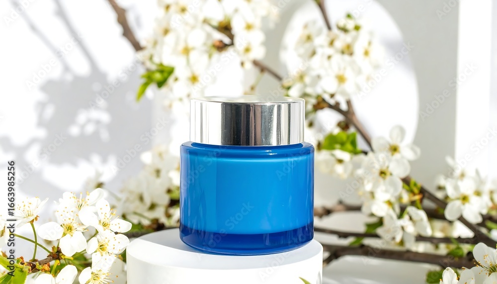 A Vibrant Blue Cosmetic Jar Sits Amidst Delicate Wallpaper Mural - Decorly Solutions | Decorly Solutions