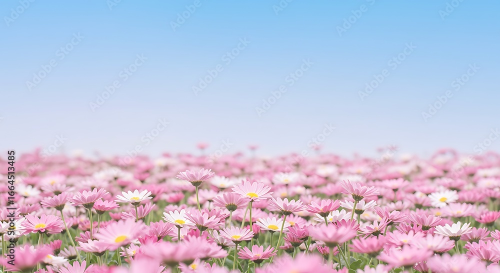 Soft focus field of pink and white daisies under a gentle sky