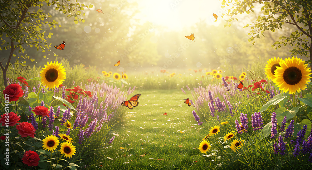 Sunlit Meadow Path With Butterflies And Flowers Wallpaper Mural - Decorly Solutions | Decorly Solutions