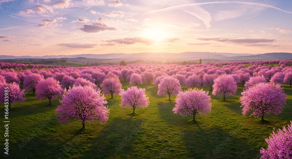Misty Spring Meadow, Blossoming Flowers, Sunrise