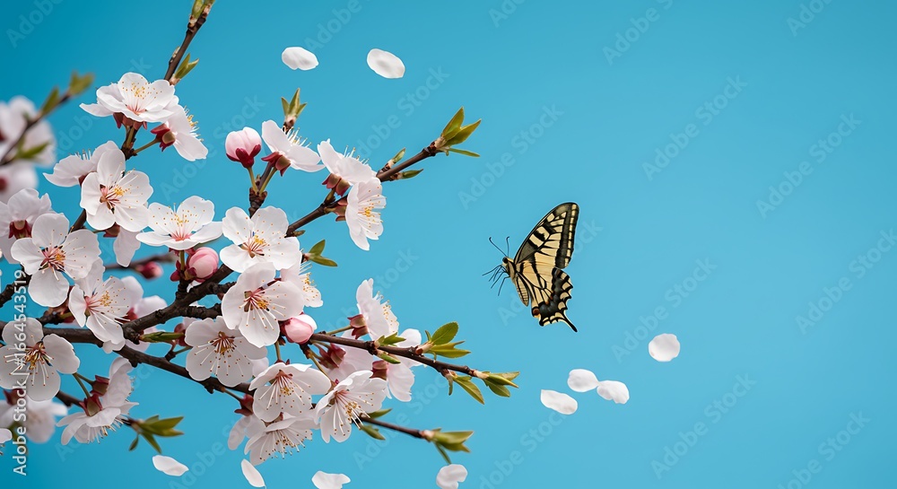 A butterfly flying in the sky, surrounded by pear blossoms, light blue background,