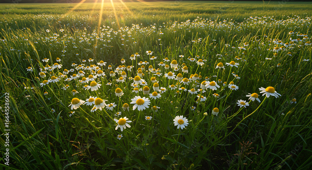 Sunrise Meadow Daisies: Blooming Wildflowers in Green Field Wallpaper