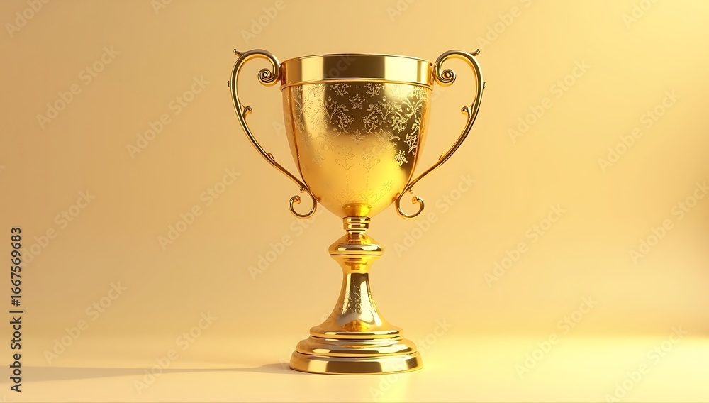 3D render of a shiny golden trophy cup placed on a clean studio background, symbolizing success and achievement.