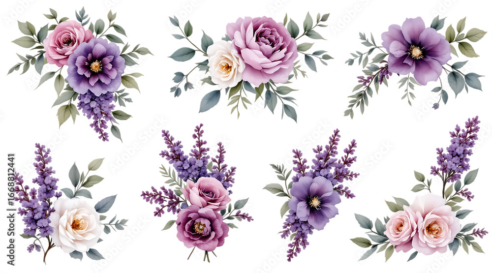 Elegant Watercolor Floral Arrangements In Shades Of Purple Wallpaper Mural - Decorly Solutions | Decorly Solutions