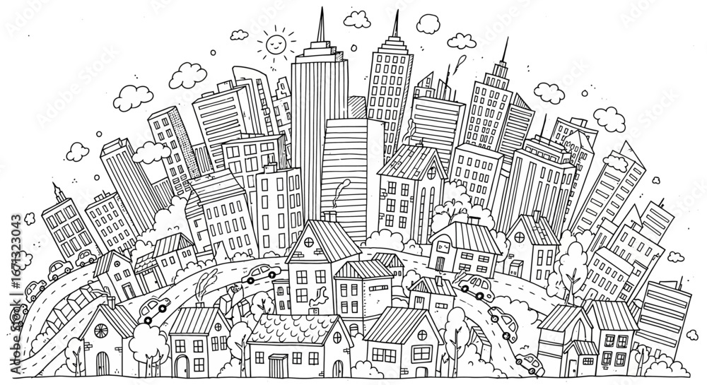 Cartoon City Skyline With Buildings Houses Cars And Wallpaper Mural - Decorly Solutions | Decorly Solutions