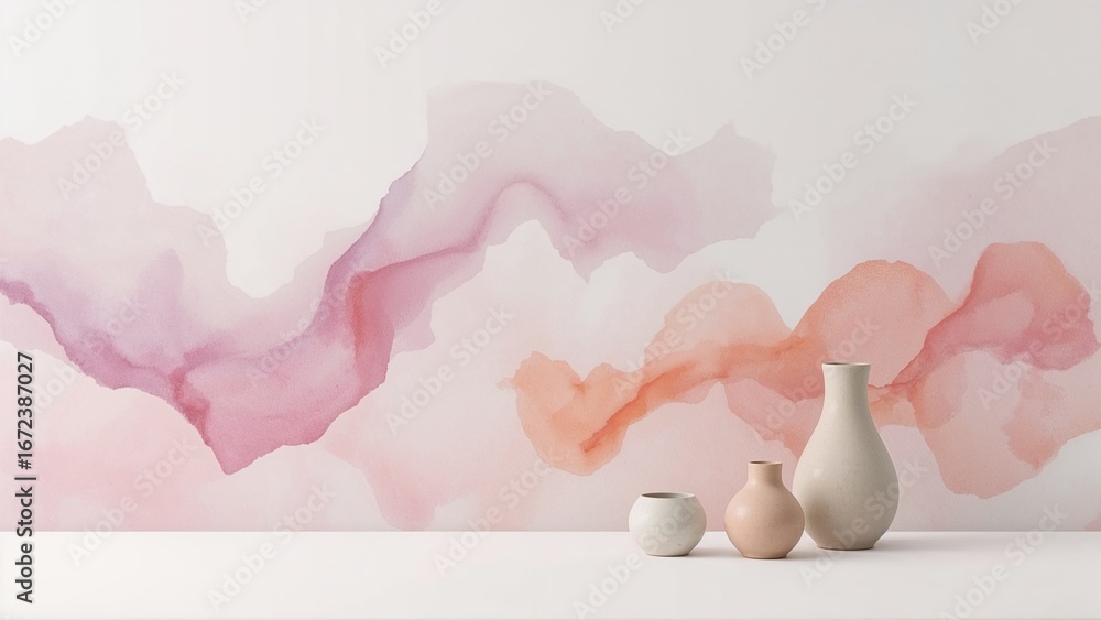 Still life of three vases on a shelf against an abstract pin Wallpaper