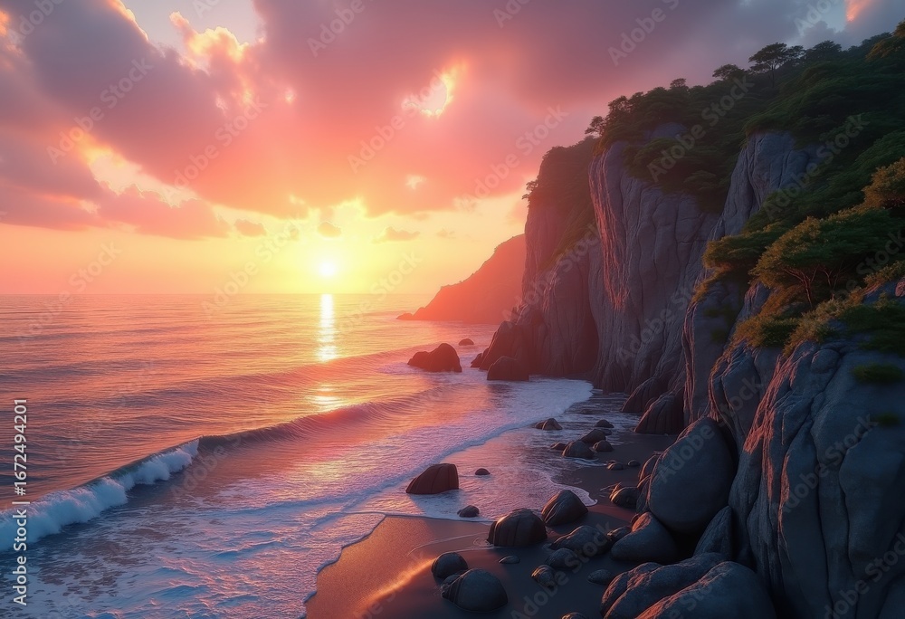 Tranquil Coastal Cliffs Sunset Horizontal Gradient Ocean View Wallpaper Mural - Decorly Solutions | Decorly Solutions