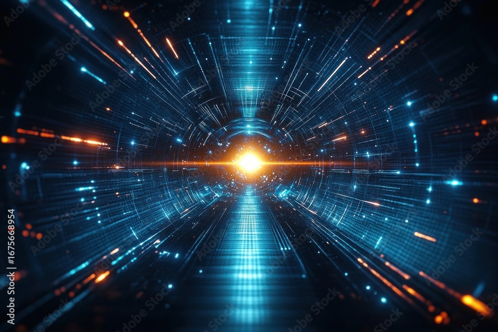 Abstract dynamic tunnel of glowing blue and orange lights converging towards a bright white center creating a sense of speed and futuristic motion